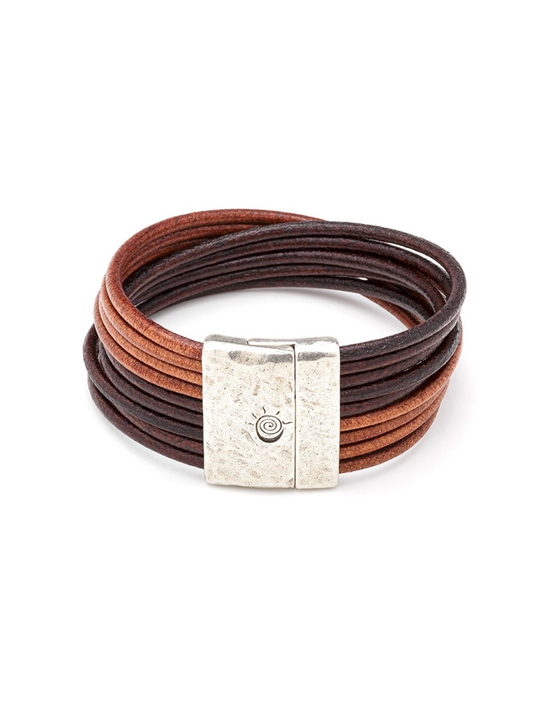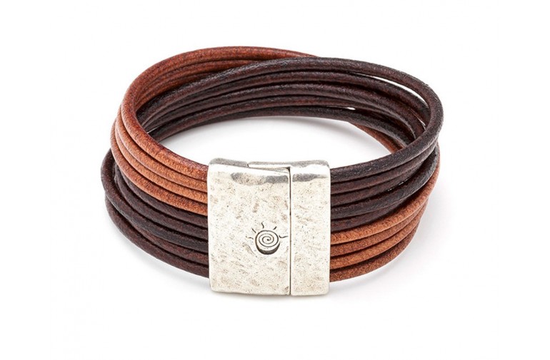 La pulsera está confeccionada con cuero en dos tonalidades de color marrón.