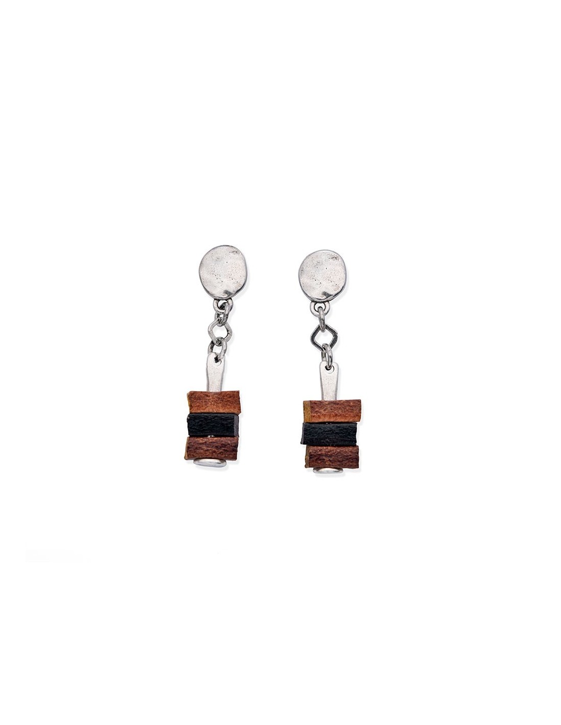 Boucles d'oreilles en cuir Enigma, faites de cuir avec des perles argentées.